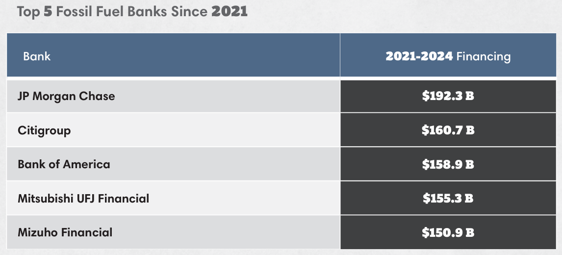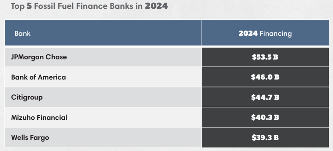 2024年,排名靠前的化石燃料融资银行依次为:摩根大通、美国银行、花旗集团、瑞穗金融集团和富国银行。