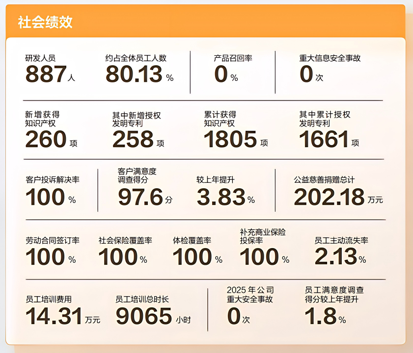创新驱动议题披露较为充分。2025年,公司研发投入占营业收入比例约18%;研发人员占比超过80%,其中80.95%以上研发技术人员拥有硕士及以上学历;累计获得知识产权1805项,体现出较强的技术导向特征。