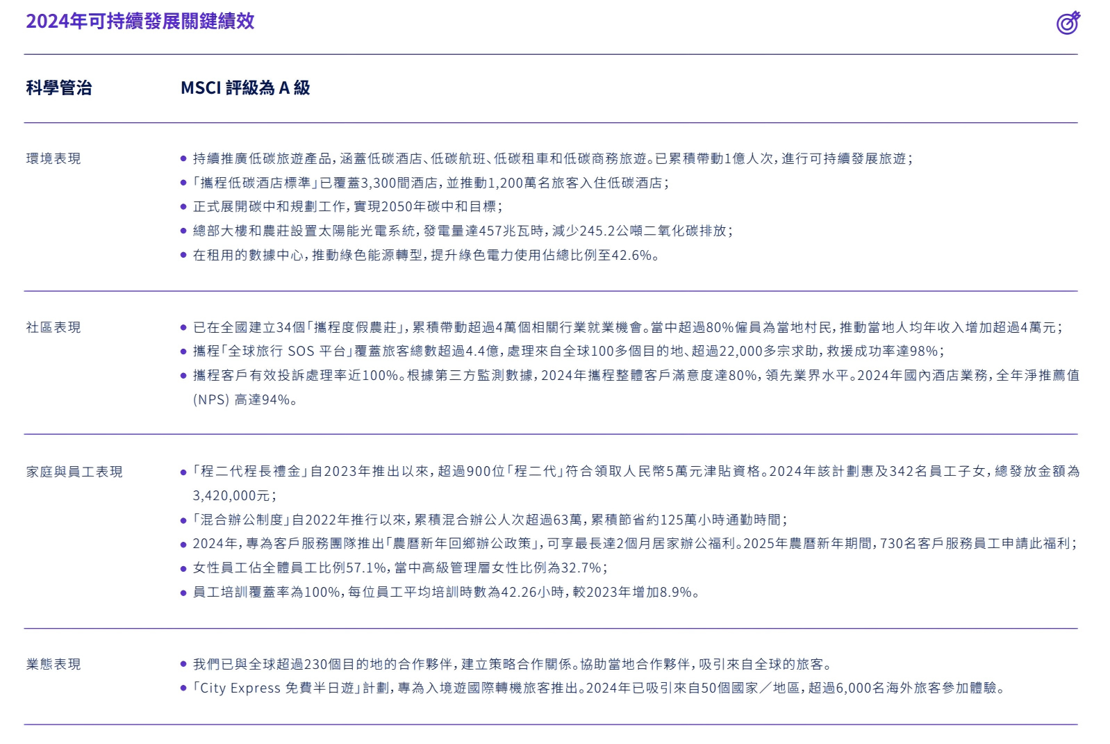 Trip.com has been disclosing ESG reports for six consecutive years. According to its "2024 Sustainability Report" released in July 2025 (covering both Ctrip and Trip.com brands), the report systematically discloses the phased progress of Trip.com Group across various areas, centered around the four sustainability strategies of "Industry-Friendly, Community-Friendly, Family-Friendly, and Environment-Friendly."